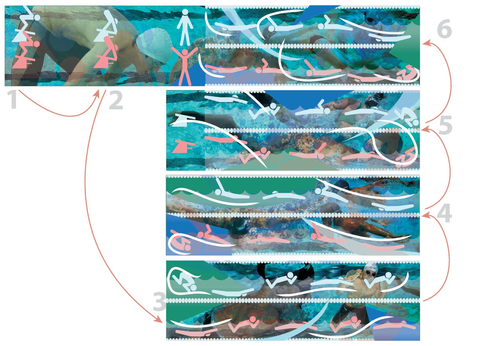 This visual score was designed to be folded into a book-like shape. That way, it could be unfolded in a zig-zag pattern to give the illusion of doing laps and flip turns while swimming. Here I have displayed the order in which the panels are unfolded.